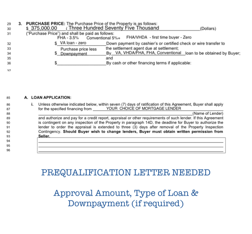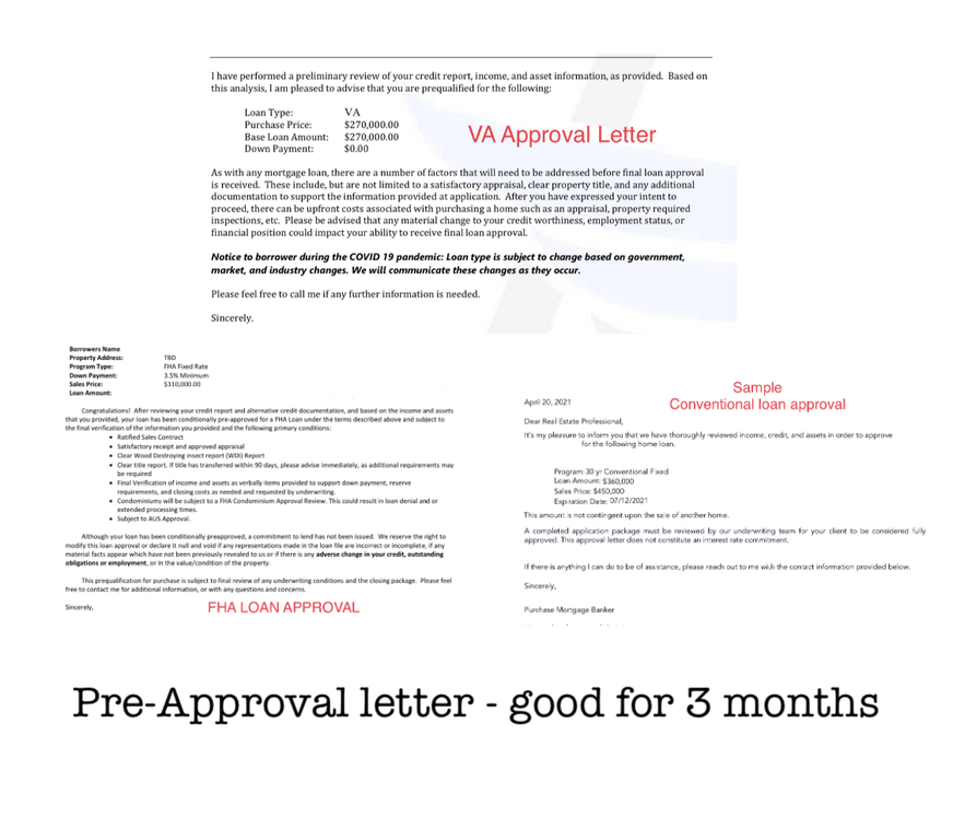 - the approval letter is also required when you submit an offer, the lender's info and type of loan will be listed on the contract (VA, Conventional, FHA)